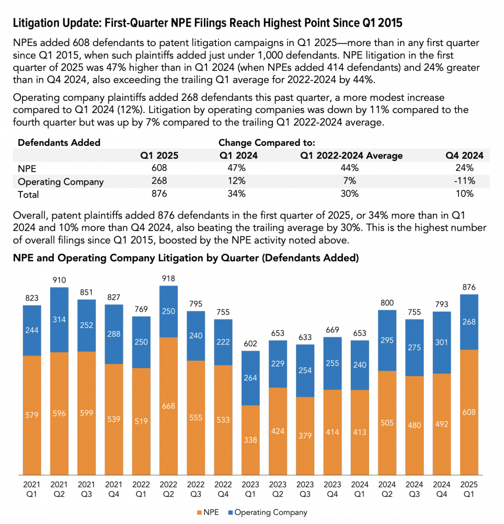 There is a startling increase in patent troll litigation, up 44% Q1 25 vs Q1 22-24, the greatest rate of increase in the last 10 years